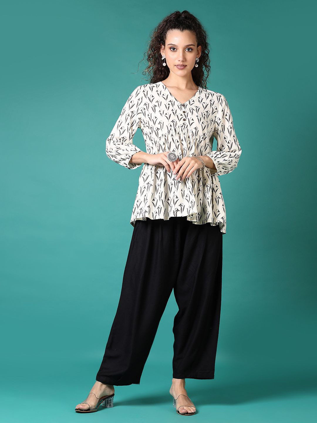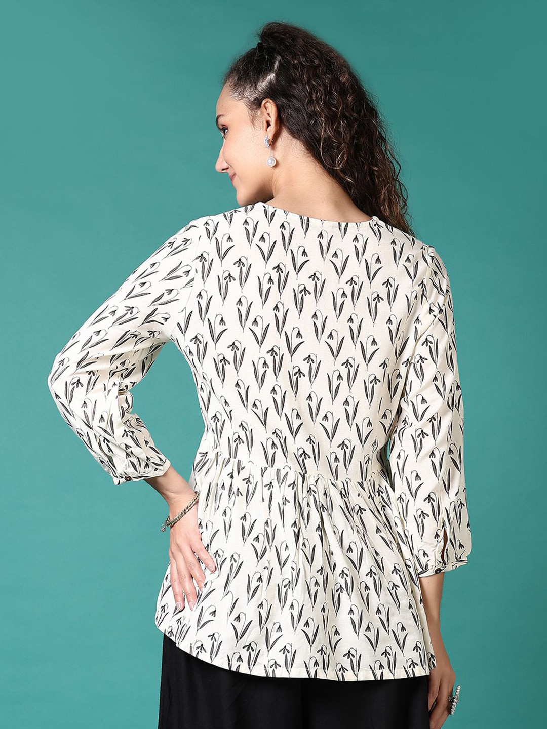 Off white & green printed tunic, has a V neck, three quarter sleeves with slip on closure